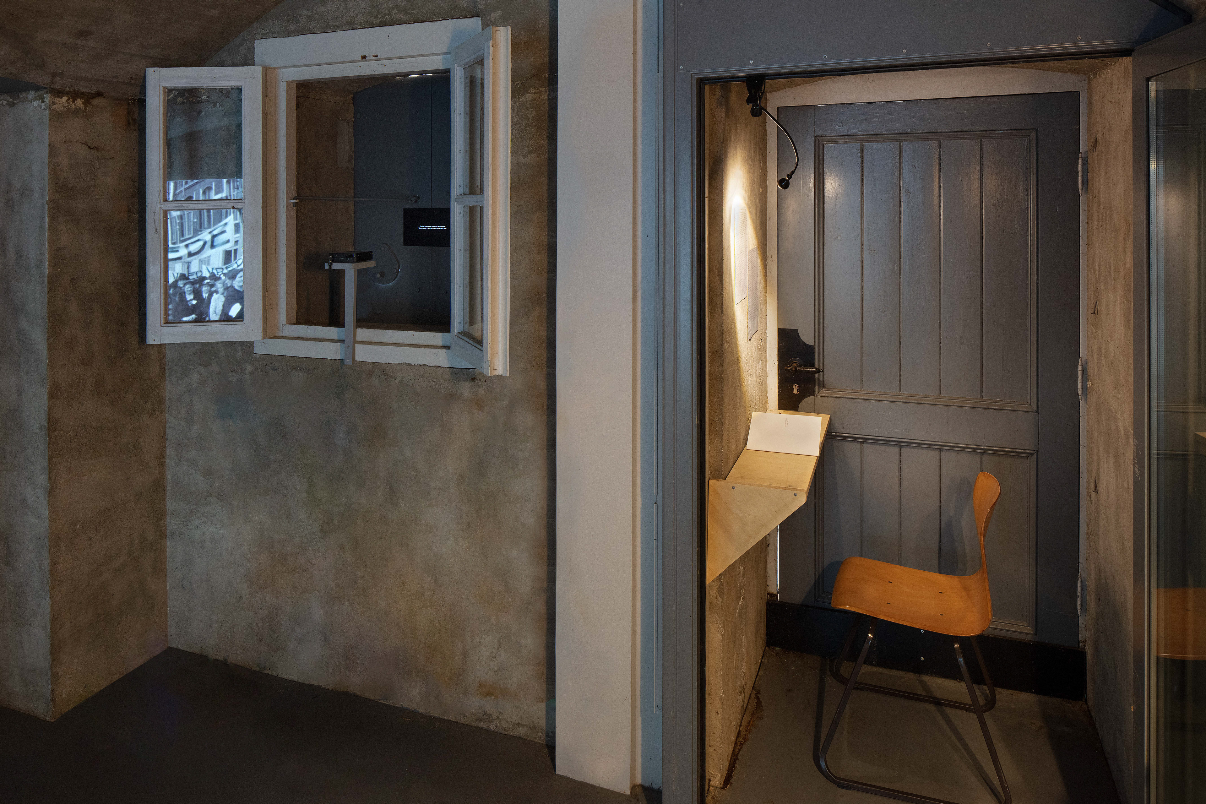 In this exhibition, Groenewegen expands her short film Remanence in dialogue with her ghostly collaborators. Combining testimonies from recently discovered oral history and never-before-seen film footage, this short film evokes a lost history of a women’s peace movement in which women worked across social divides towards collective action in the 1930s. The images of the women’s movement are re-framed by oral history testimonies of participants, now elderly, looking back at their efforts – and the course of history – during interviews conducted by feminist researchers in the 1980s. The projection of Remanence features the display of a letter by Henk Hos, the man who filmed the most striking film material re-used in Groenewegen's film. During her research, Groenewegen recovered and saved his short film, hidden in an archive not dedicated to film preservation. Shortly after filming the last women’s peace march of 1939, Hos joined the resistance during WW2. He was arrested and executed. The night before his death, he wrote a goodbye letter to his friends and partner; one of the women seen in the re-assembled material in Remanence. Groenewegen addresses Henk in a third audio piece projected on the shutters of the bunker, addressing her reuse of the film material he produced in support of the women’s movement. Interweaving and reactivating different historical strata, Groenewegen produces a narrative of gender politics, resistance, and internationalist struggles against rising fascism.