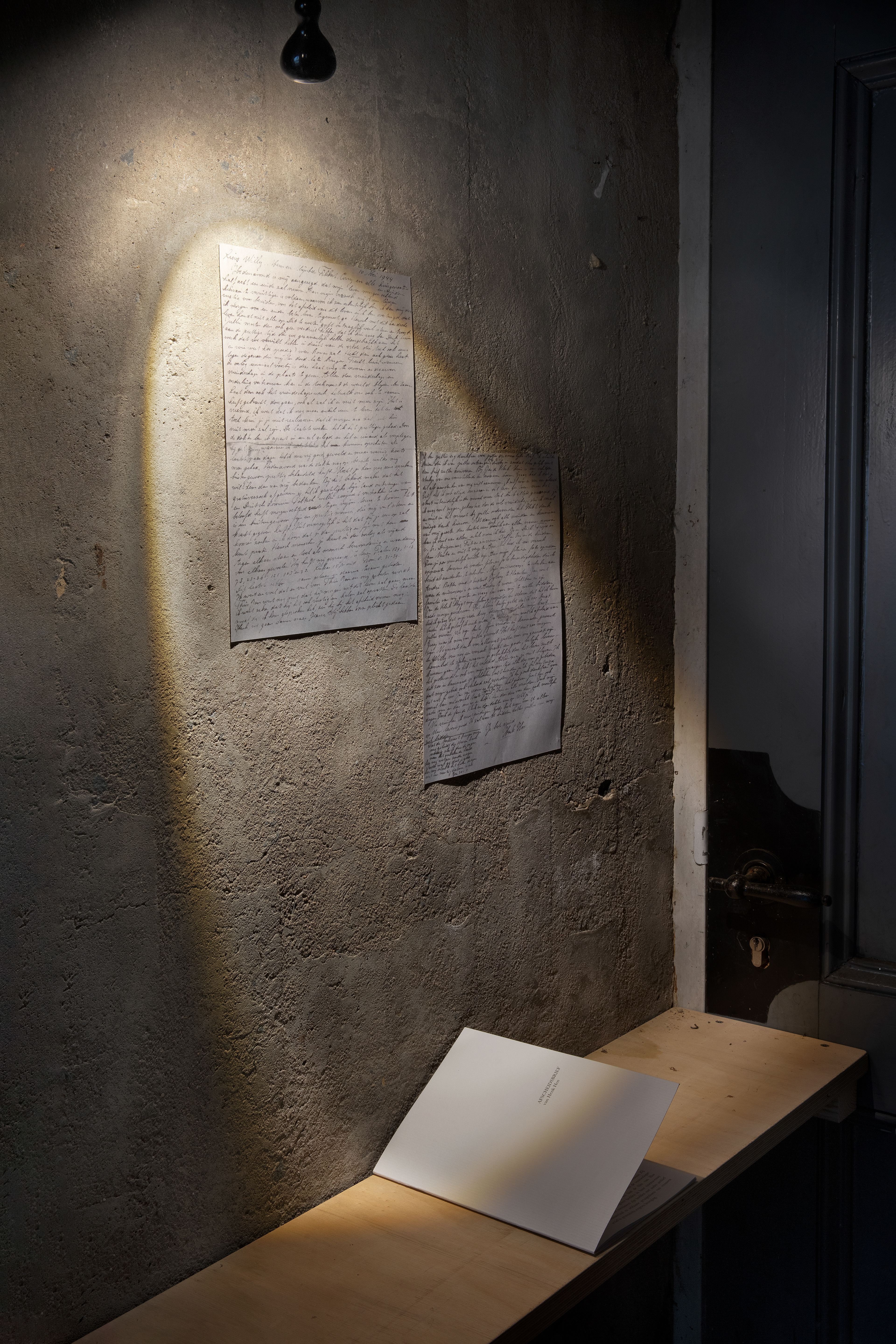 Film projection loop, letter on display and translation booklet, audio piece with projected translation.